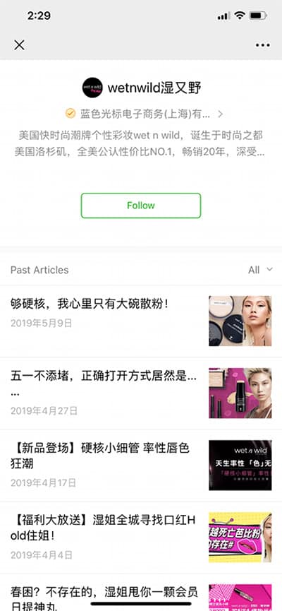 When translating the profile information to English, you'll find a company name: Blue Cursor E-commerce (Shanghai) Co., Ltd. It's unclear whether this company is responsible for their WeChat profile only, or for their online presence in China, or for their presence in stores. The company offers internet marketing, mobile, and e-commerce services, so it seems unlikely they would be linked to Wet n Wild's distribution in stores.